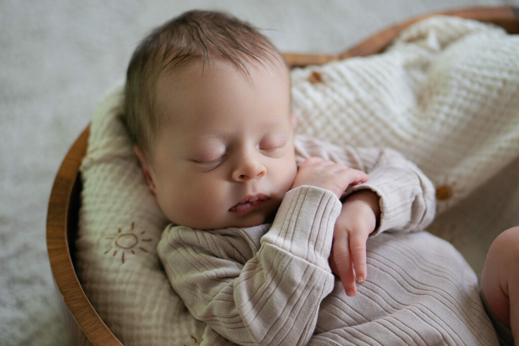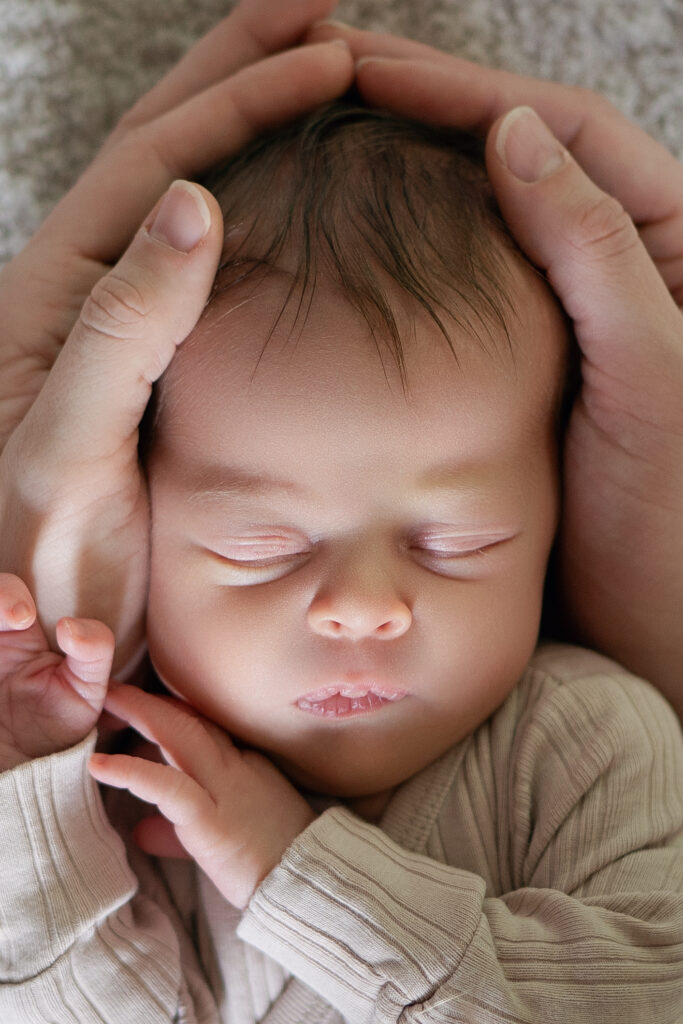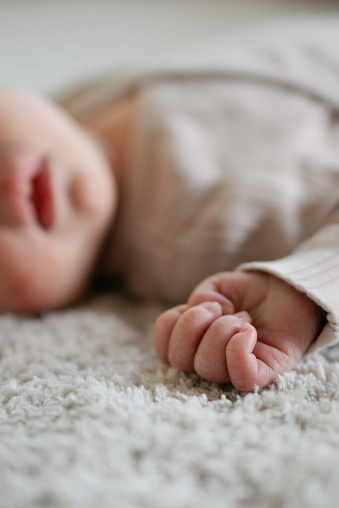 Photo de naissance capturant les premiers instants d’un bébé, réalisée par Claire Stroh Photographe à Souffelweyersheim.